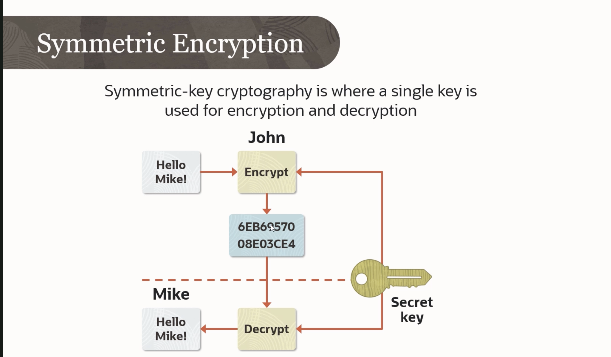 Symmetric Encryption Symmetric-key cryptography is where a single key is used for encryption and decryption John Hello Mike! Encrypt 6EB69570 08E03CE4 Mike Secret key Hello Mike! Decrypt