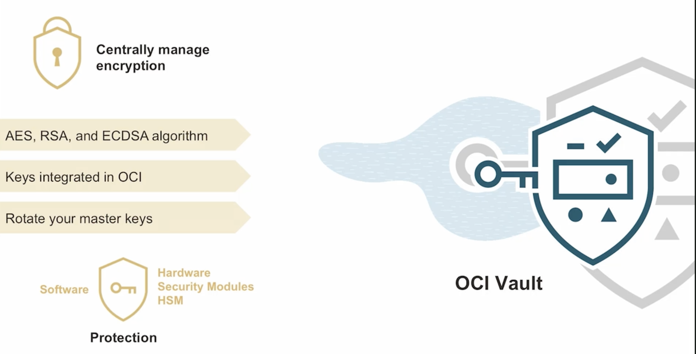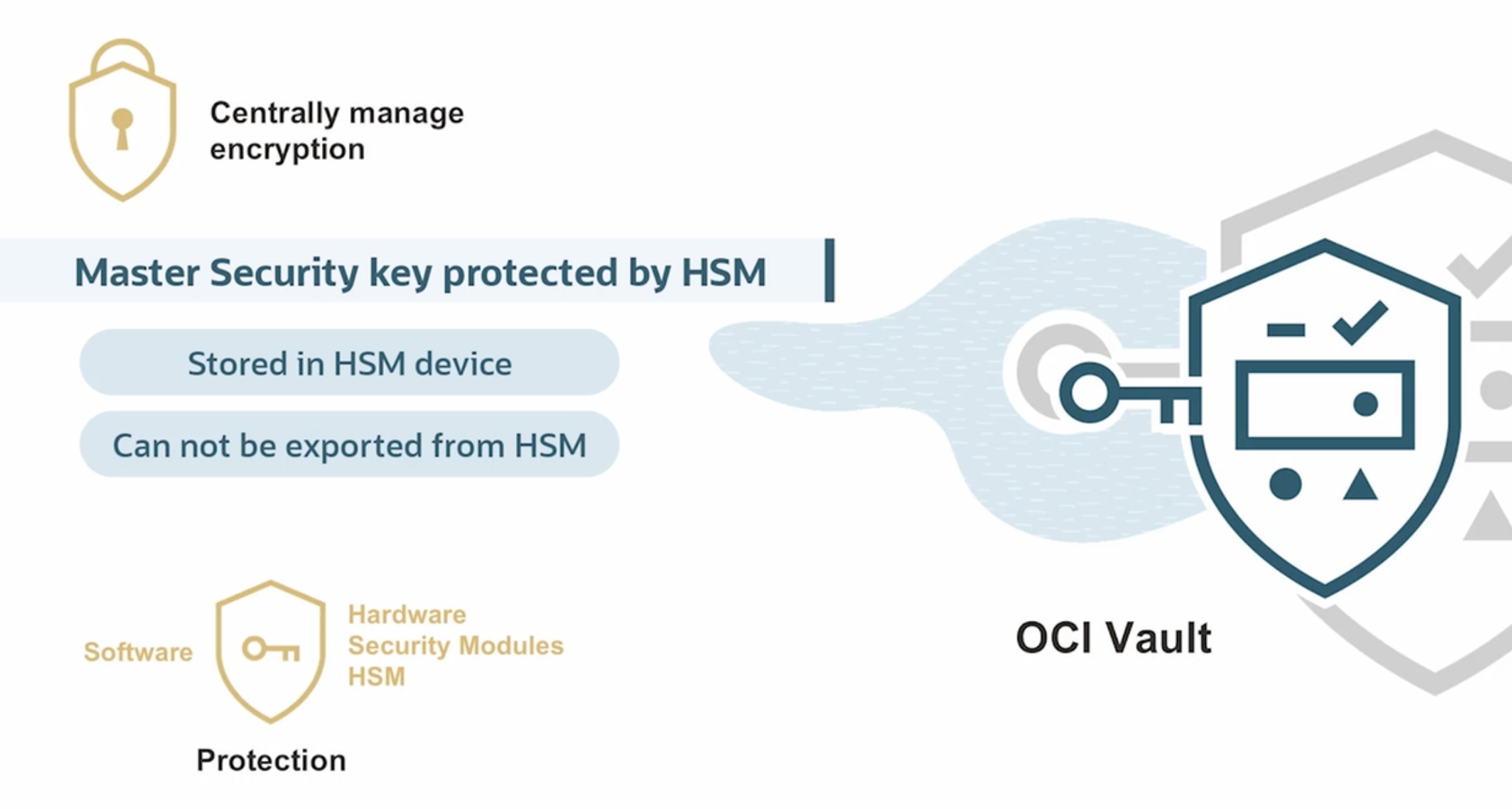 Centrally manage encryption Master Security key protected by HSM Stored in HSM device - OT Can not be exported from HSM - Ca Hardware Security Modules HSM Software 0 OCI Vault Protection