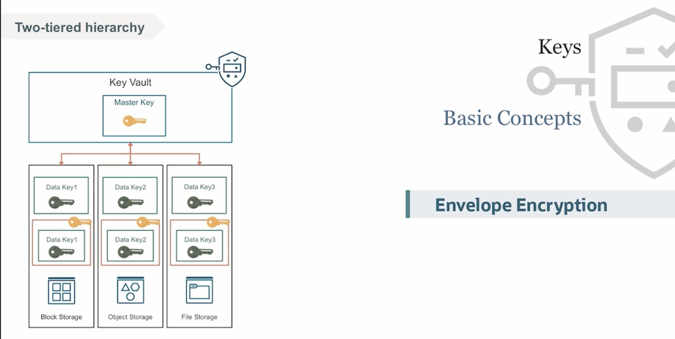Two-tiered hierarchy Keys O Key Vault Master Key On Basic Concepts Data Key1 Data Key2 Data Key3 Envelope Encryption Data Key1 Data Key2 Data Key3 AO Block Storage Object Storage File Storage