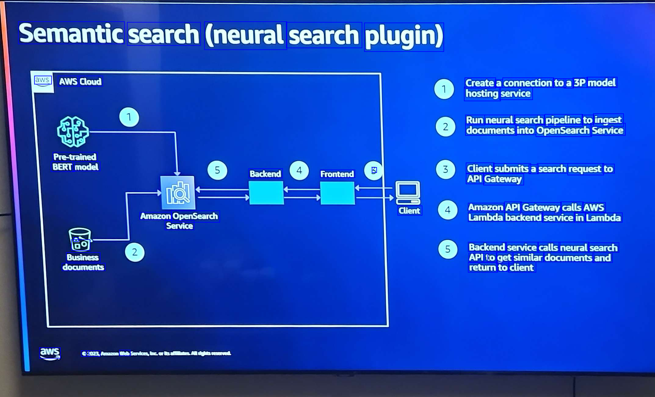 Semantic search (neural search plugin) aws AWS Cloud Create a connection to a 3P model hosting service Run neural search pipeline to ingest documents into OpenSearch Service Pre-trained BERT model 3 Client submits a search request to API Gateway Backend Frontend Client Amazon API Gateway calls AWS Lambda backend service in Lambda Amazon OpenSearch Service A 09 Business documents Backend service calls neural search API1 to get similar documents and retum to client aws o 2023 Heb