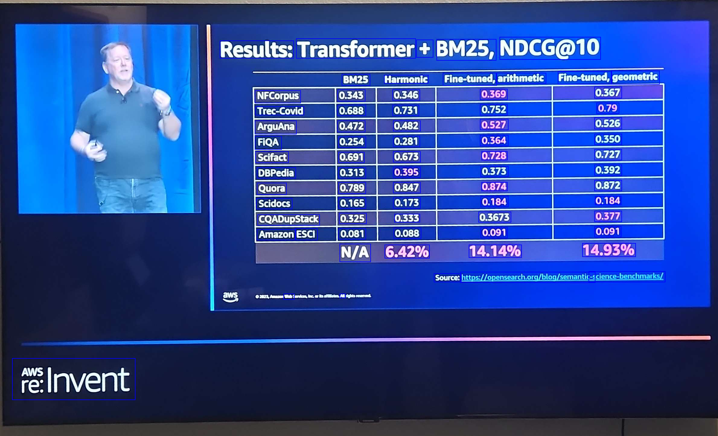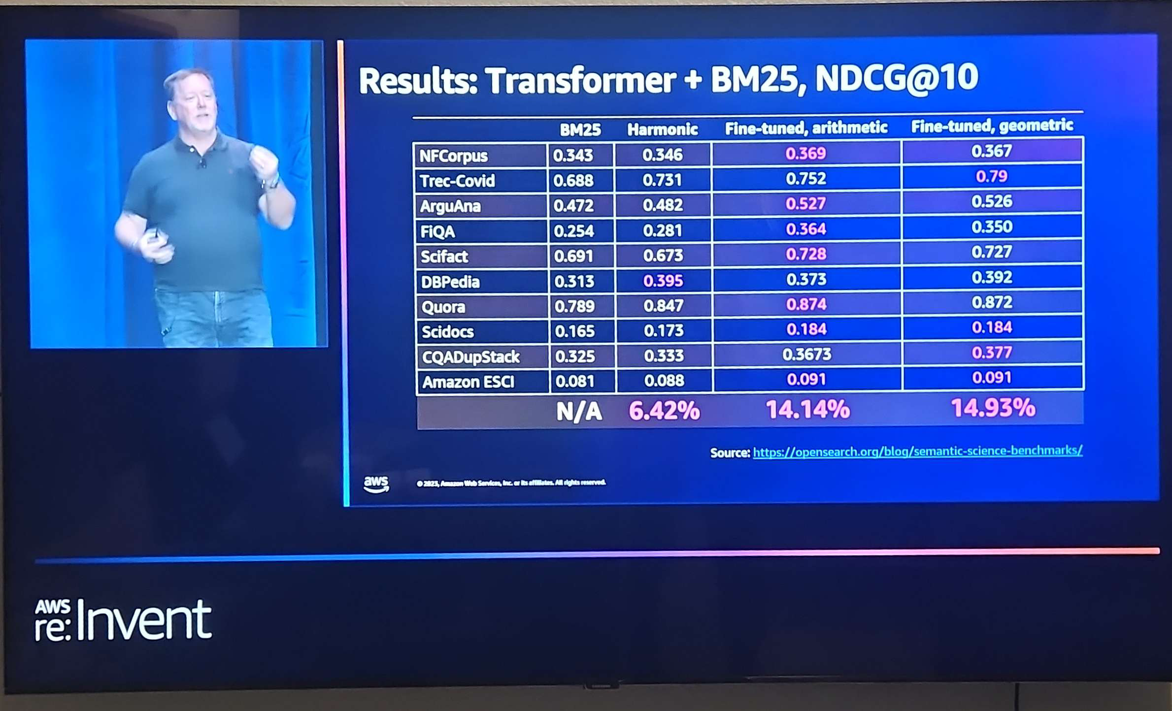 Results: Transformer + BM25, NDCG@10 BM25 Harmonic Fine-tuned, arithmetic Fine-tuned, geometric NFCorpus Trec-Covid ArguAna FIQA Scifact DBPedia Quora Scidocs 0.343 0.688 0.472 0.254 0.691 0.313 0.789 0.165 0.346 0.731 0.482 0.281 0.673 0.395 0.847 0.173 0.333 0.088 0.369 0.752 0.527 0.364 0.728 0.373 0.874 0.184 0.3673 0.091 14.14% 0.367 0.79 0.526 0.350 0.727 0.392 0.872 0.184 0.377 0.091 14.93% CQADupStack 0.325 Amazon ESCI 0.081 N/A 6.42% Source: htps//opensearchors/blog/semantic: science-benchmarks/ Wb A relnvent