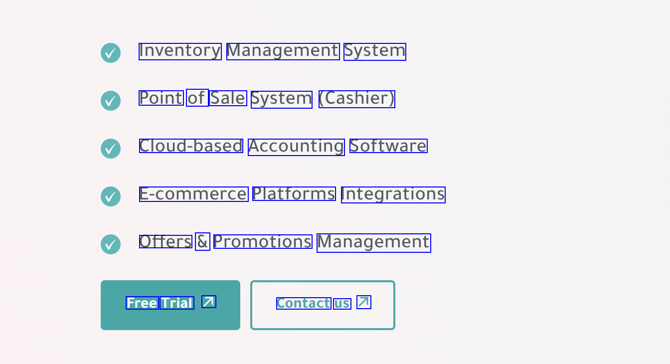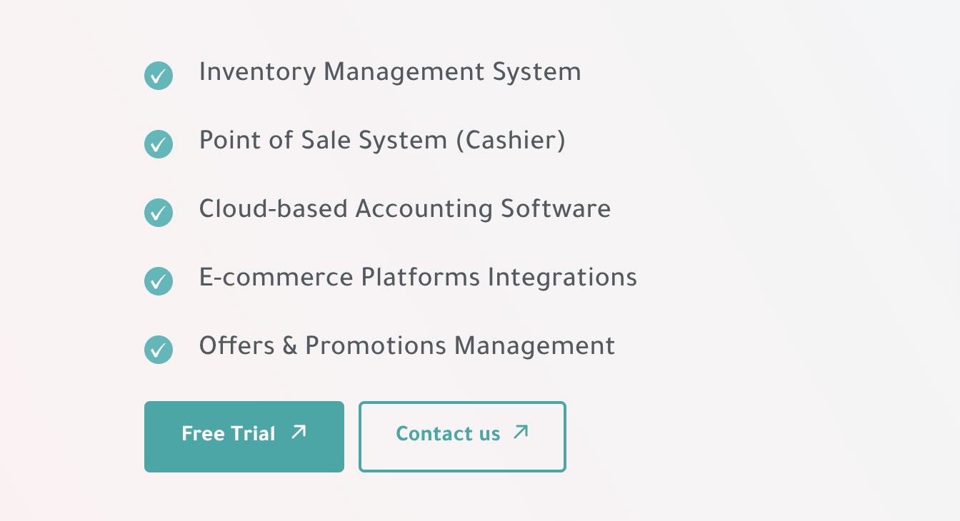 Inventory Management System Point of Sale System (Cashier) Cloud-based Accounting Software E-commerce Platforms Integrations Offers & Promotions Management Free Trial 7 Contact us 7
