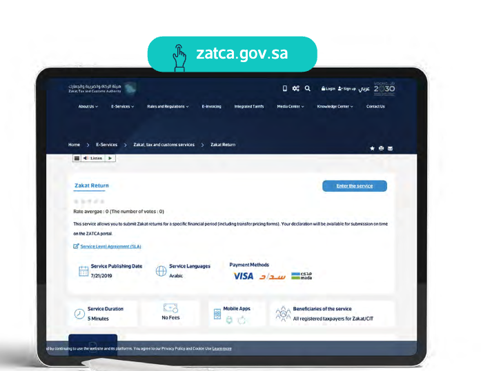 zatca.gov.sa dyegig aujalg - dia m ax ne Custone Aher Aboutus o 9 Alog VUE 2 30 servces aues and lrquatens Anvoking egrendtants Heca enter Knowtedoe center Contactus Home > E-Services > Zarat, tax andcussoms services > Zaa Return - Lisen Zakat Return Enter theservice Rate wvergae: o (The number of votes - 0) This: service allowsy youto submit: Zakatretumns for as specific lnancial period Indi.dngtansfergricngt forms). Your dedaration wilit be avalable for submission on the ZATCA portal Servicel Level Agreement ISLAI Service Publishing Date 7021/2019 Service Languages Arabic PaymentMethods VISA Daw B mada Servicel Duration SMinutes Nol Fees Mobile Apps Beneficianes oft the service All regsteredtampayers for ZakatCi e - - ae the webste ande purtoms Youa agee so0 our PTVACy Policy and Cockde Use Leammore