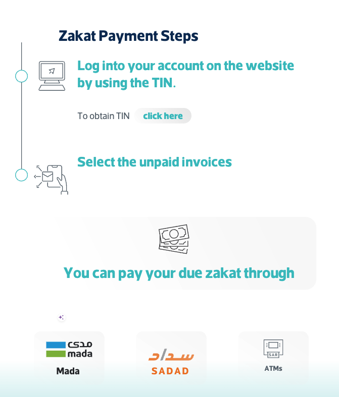 Zakat Payment Steps - Log into your account on the website by using the TIN. To obtain TIN click here Select the unpaid invoices - 1 You can pay your due zakat through (S2D mada Mada slaw SADAD SAR ATMS