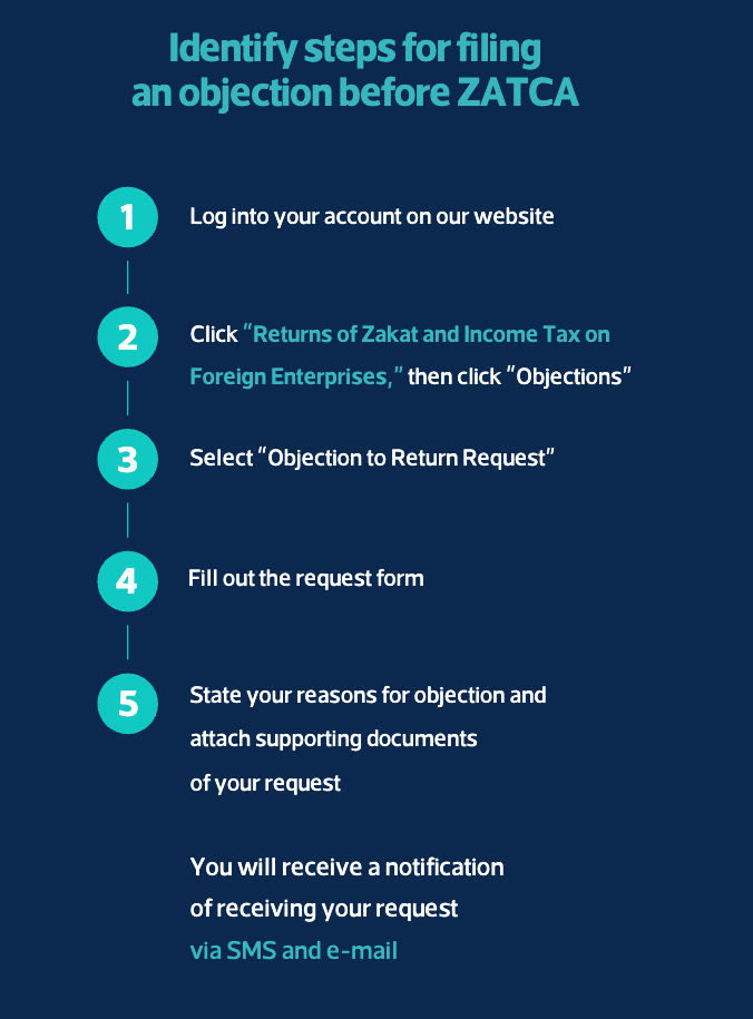 Identifystepsfor filing anobjectionbefore ZATCA Log into your account on our website L . Click "Returns of Zakat and Income Tax on Foreign Enterprises, II then click "Objections" 5 Select "Objection to Return Request" Fill out the request form 5 State your reasons for objection and attach supporting documents ofyour request You will receive a notification ofreceiving your request via SMS and e-mail