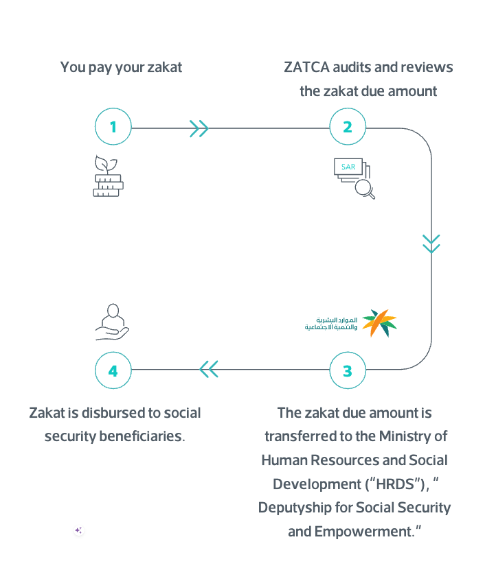 You pay your zakat ZATCA audits and reviews the zakat due amount 2 SAR - auctais dyjiull UI datillg ailgall 3 Zakatis disbursedto social security beneficiaries. The zakat due amount tis transferred to the Ministry of Human Resources and Social Development ("HRDS"), I Deputyship for Social Security and Empowerment. -