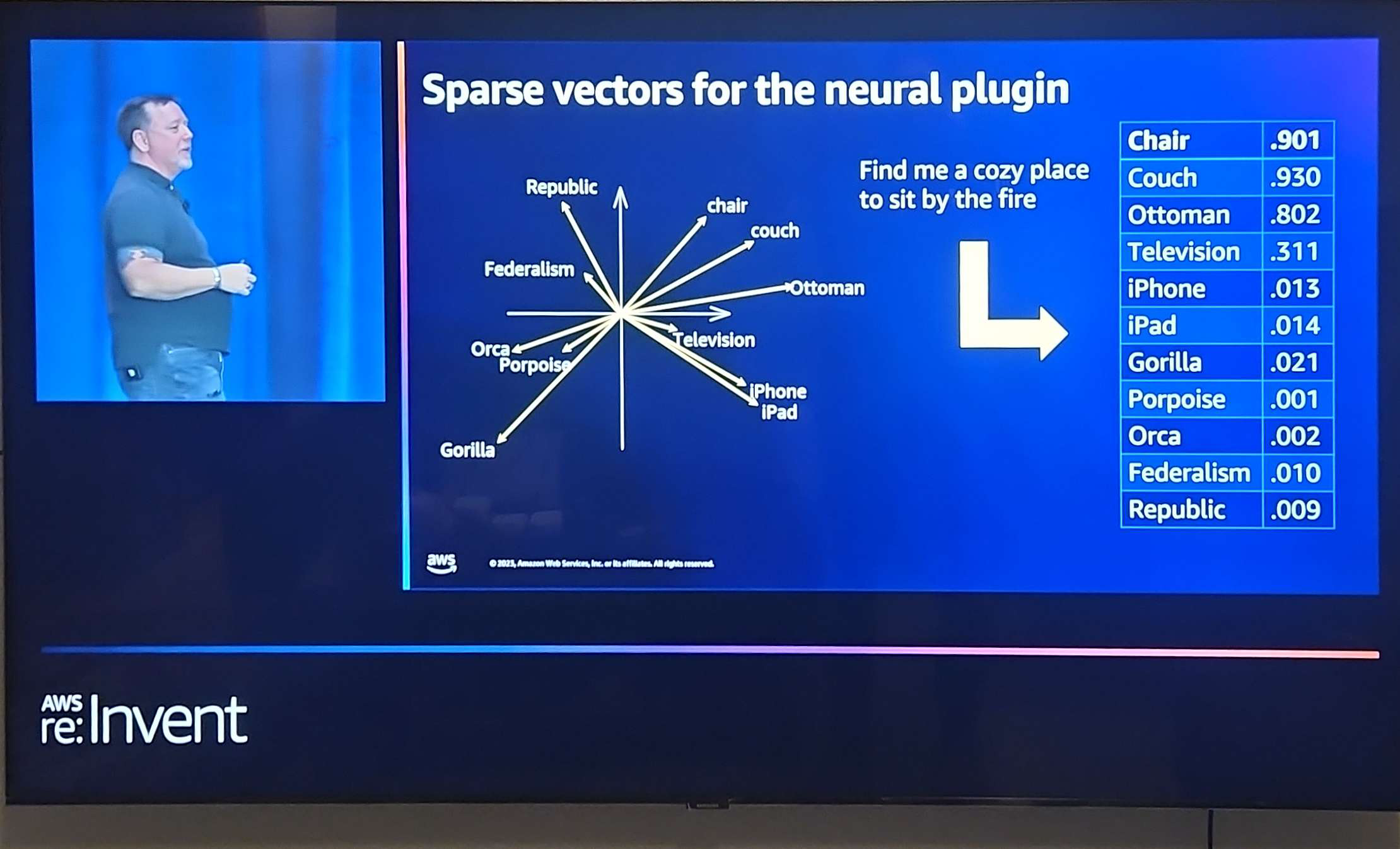 Sparse vectors for the neural plugin Chair .901 .930 Find me a coZy place Couch to sit by the fire Republic chair couch Ottoman .802 Television .311 iPhone iPad Gorilla Federalism Ottoman .013 .014 .021 Orca Porpoise Television Phone iPad Porpoise .001 Orca .002 Gorilla Federalism .010 Republic .009 2 Wb relnvent