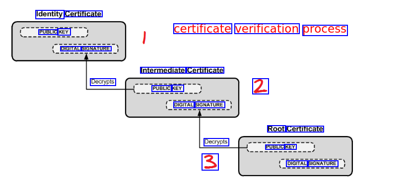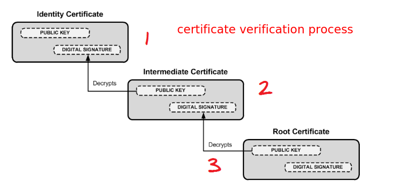 Identity Certificate PUBLIC KEY certificate verification process DIGITAL SIGNATURE Intermediate Certificate Decrypts PUBLIC KEY 2 DIGITAL SIGNATURE Root Certificate Decrypts PUBLIC KEY 3 DIGITAL SIGNATURE