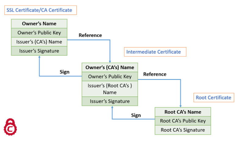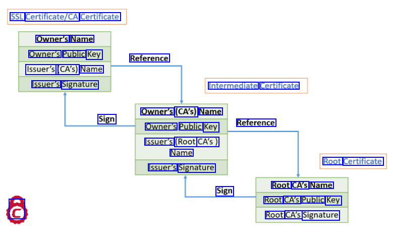 SSL Certificate/CA Certificate Owner's Name Owner's Public Key Issuer's (CA's) Name Reference Issuer's Signature Intermediate Certificate Owner's (CA's) Name Owner's Public Key Issuer's (Root CA's) Sign Reference Name Root Certificate Issuer's Signature Root CA's Name Root CA's Public Key Root CA's Signature Sign @