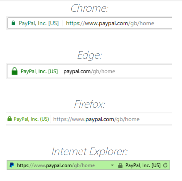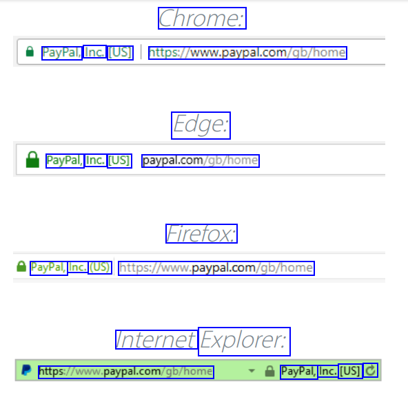 Chrome: PayPal, Inc. [US] https/www.paypal.com/gb/home Edge: PayPal, Inc. [US] paypal.com/gb/home Firefox: PayPal, Inc. (US) https/www.paypal.com/gb/home Internet Explorer: https/www.paypal.com/gb/home PayPal, Inc. [US] C