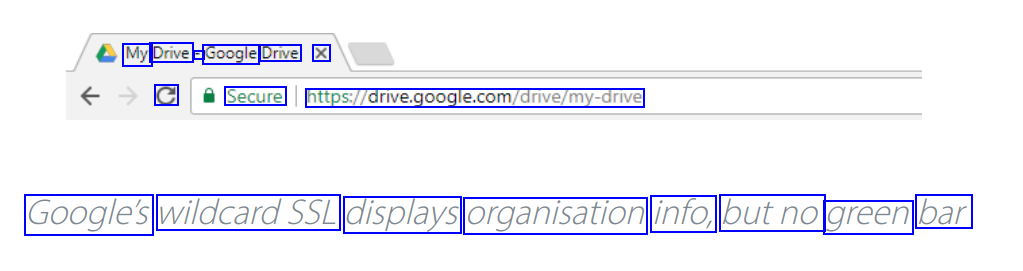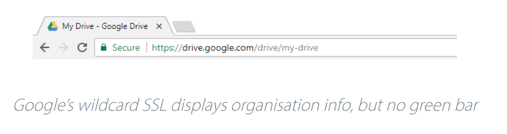 My Drive - Google Drive X C Secure https://drive.google.com/dnive/my-drive Google's wildcardSSL displays organisation info, butno green bar