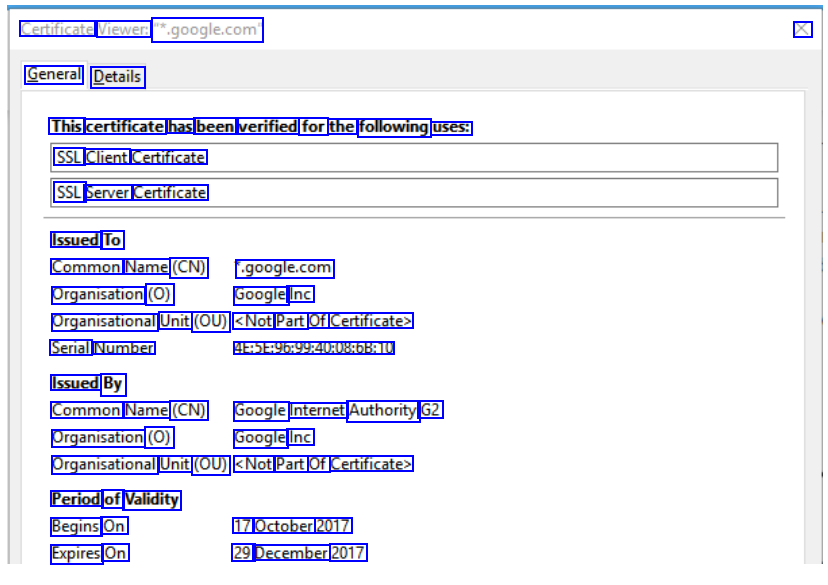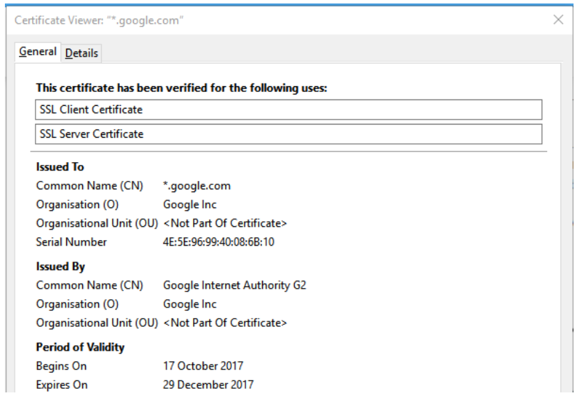 Certificate Viewer: .google.com" X General Details This certificate has been verified for the following uses: SSL Client Certificate SSL Server Certificate Issued To Common Name (CN) Organisation (O) .google.com Google Inc Organisational Unit (OU) <Not Part Of Certificate> Serial Number Issued By 4E:5E:96:99:40:08:6B:10 Common Name (CN) Google Internet Authority G2 Organisation (O) Google Inc Organisational Unit (OU) <Not Part Of Certificate> Period of Validity Begins On Expires On 17 October 2017 29 December 2017