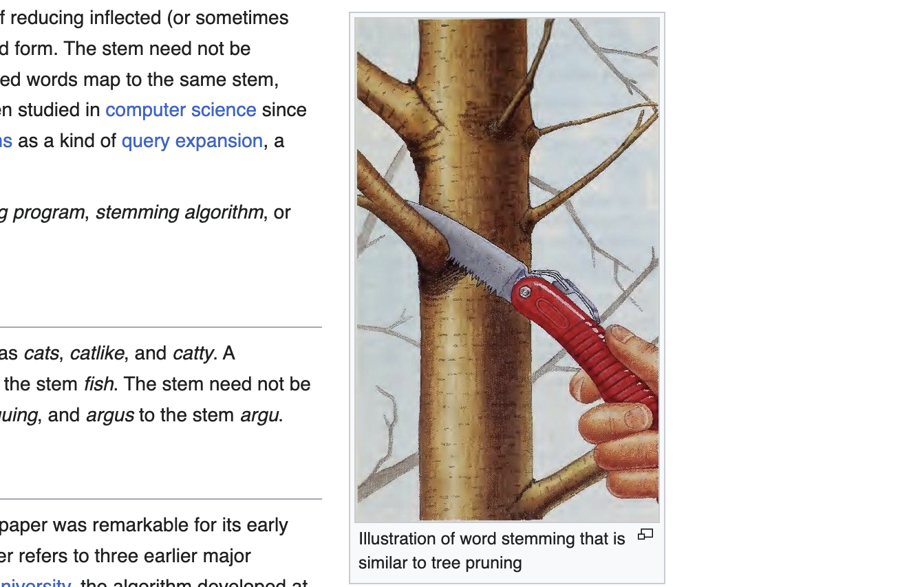 StemmingJanuary 24, 2024 | seedling, permanenttags :Summary #In linguistic morphology and information retrieval, stemming is the process of reducing inflected (or sometimes derived) words to their word stem, base or root form —generally a written word form. wikipediaNo notes link to this note