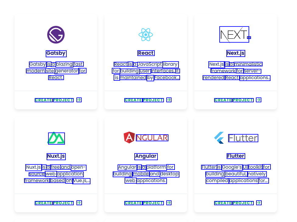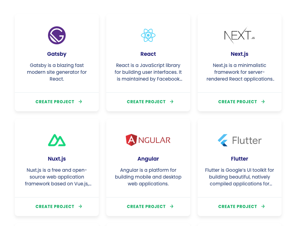 3S NEXT Gatsby React Next.js Gatsby is a blazing fast modern site generator for React is a Javascript library for building user interfaces. It is maintained by Facebook.. Next.js is a minimalistic framework for server- rendered React applications.. React. CREATE PROJECT - CREATE PROJECT - CREATE PROJECT - DA NGULAR Flutter Nuxt.js Angular Flutter Nuxt.js is a free and open- source web application framework based on Vue.js, Angular is a platform for building mobile and desktop web applications. Flutter is Google's UI toolkit for building beautiful, natively compiled applications for... CREATE PROJECT - CREATE PROJECT - CREATE PROJECT >