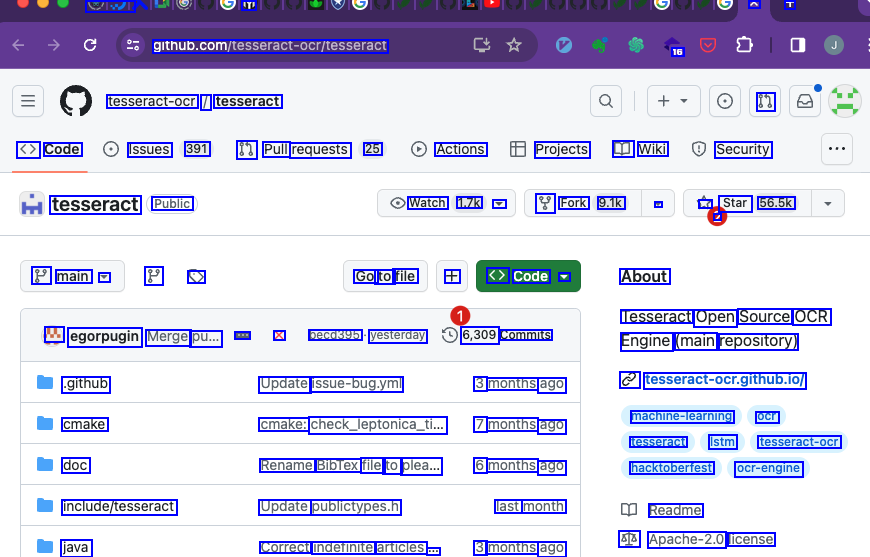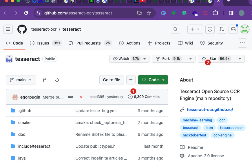 W TU A T githuo.comlesseract-ocrlesseract 16 tesseract-ocr I tesseract 81 <> Code Issues 391 81 Pull requests 25 Actions Projects a Wiki Security tesseract Public Watch 1.7k V e Fork 9.1k V L7 Star 56.5k / P main V P S Go to file + <> Code About Tesseract Open Source OCR Engine (main repository) la egorpugin Merge pu... : X becd395 yesterday 6,309 Commits .github Update issue-bug.yml 3 months ago € tesseract-ocrgithub.o) machine-learning ocr tesseract Istm tesseract-ocr hacktoberfest ocr-engine cmake cmake: check_Jeptonica_ti.. 7 months ago doc Rename BibTex file to plea... 6 months ago include/tesseract Update publictypes.h last month Readme 44 Apache-2.0 license java Correct indefinite articles : 3 months ago