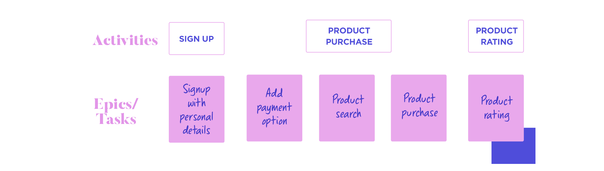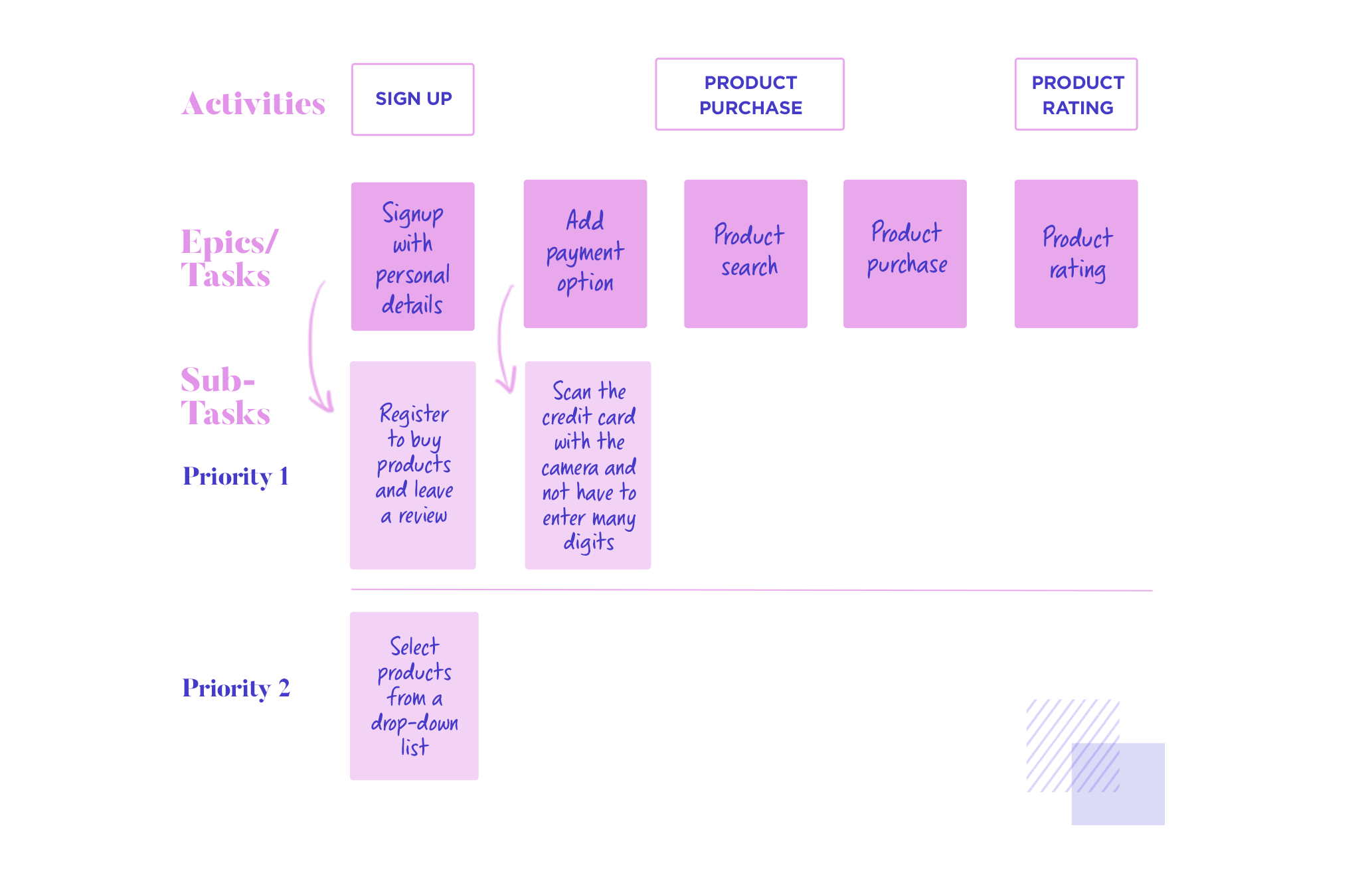 Our epics will form what’s called a “backbone” and will represent a left-to-right narrative along an x-axis. It’ll show a logical sequence of steps a user will take to complete each activity. It’s an important part of the user story map as it lays the foundation for the entire product development flow. Below the epics, we’ll place our user stories.