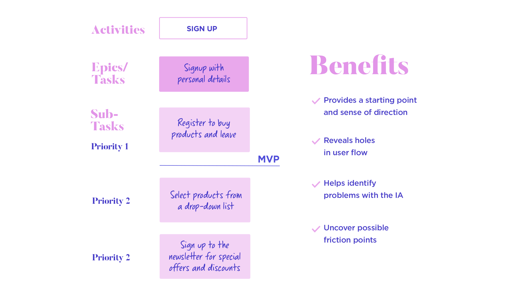 One of the main benefits of user story mapping is that it helps us picture how a user might use our product in real life and thus prioritize feature development accordingly.