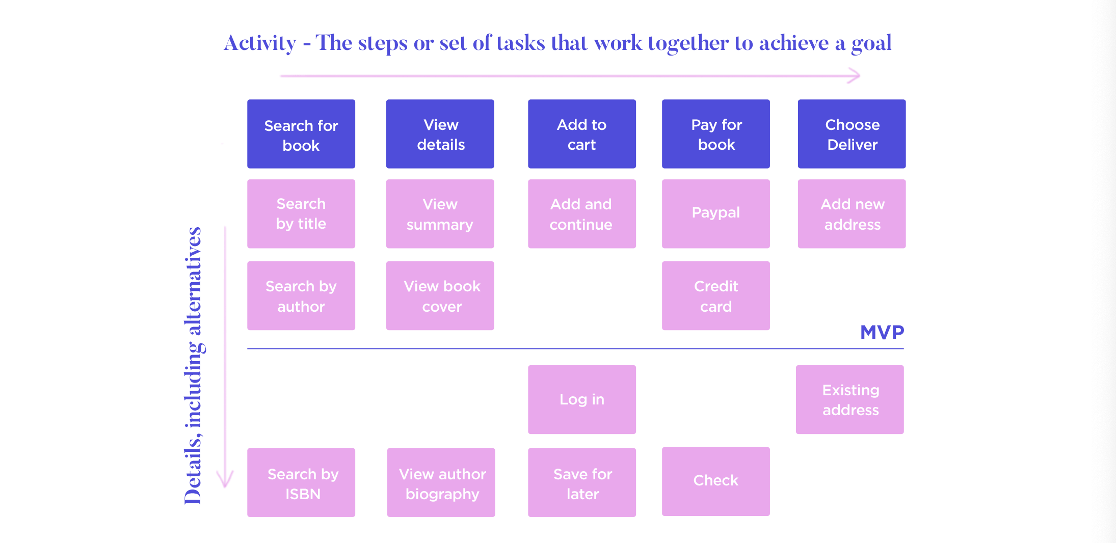 The first element you’ll add to your user story maps will be “activities”. Each activity card or sticky note will represent a process that your user goes through in your product.