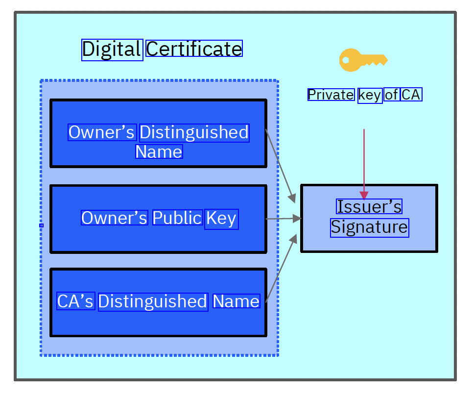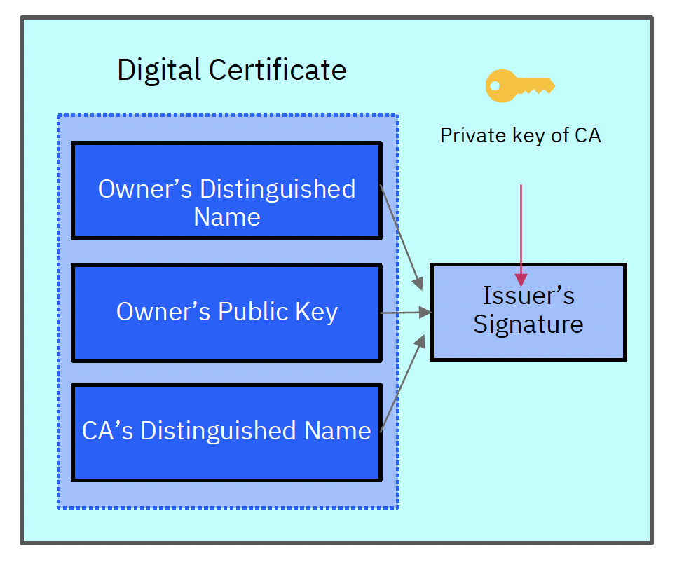 Digital Certificate Private key of CA Owner's Distinguished Name Issuer's Signature Owner's Public L Key CA's Distinguished Name