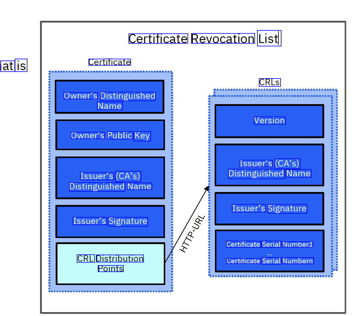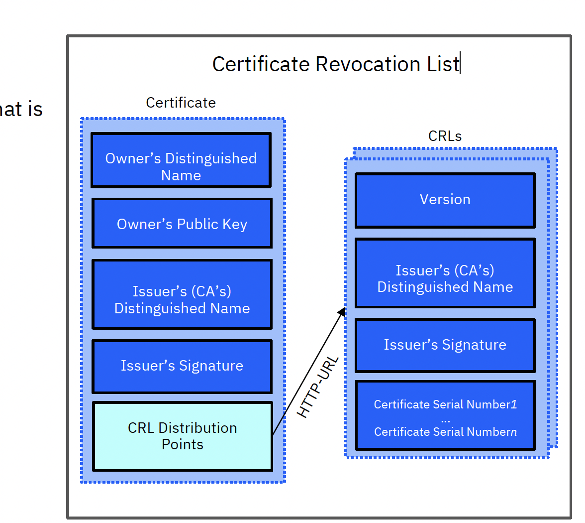 Certificate Revocation List Certiticate at is CRLS Owner's Distinguished Name Version Owner's Public Key Issuer's (CA's) Distinguished Name Issuer's (CA's) Distinguished Name Issuer's Signature Issuer's Signature Certificate Serial Numberl Certificate Serial Numbern CRL Distribution Points