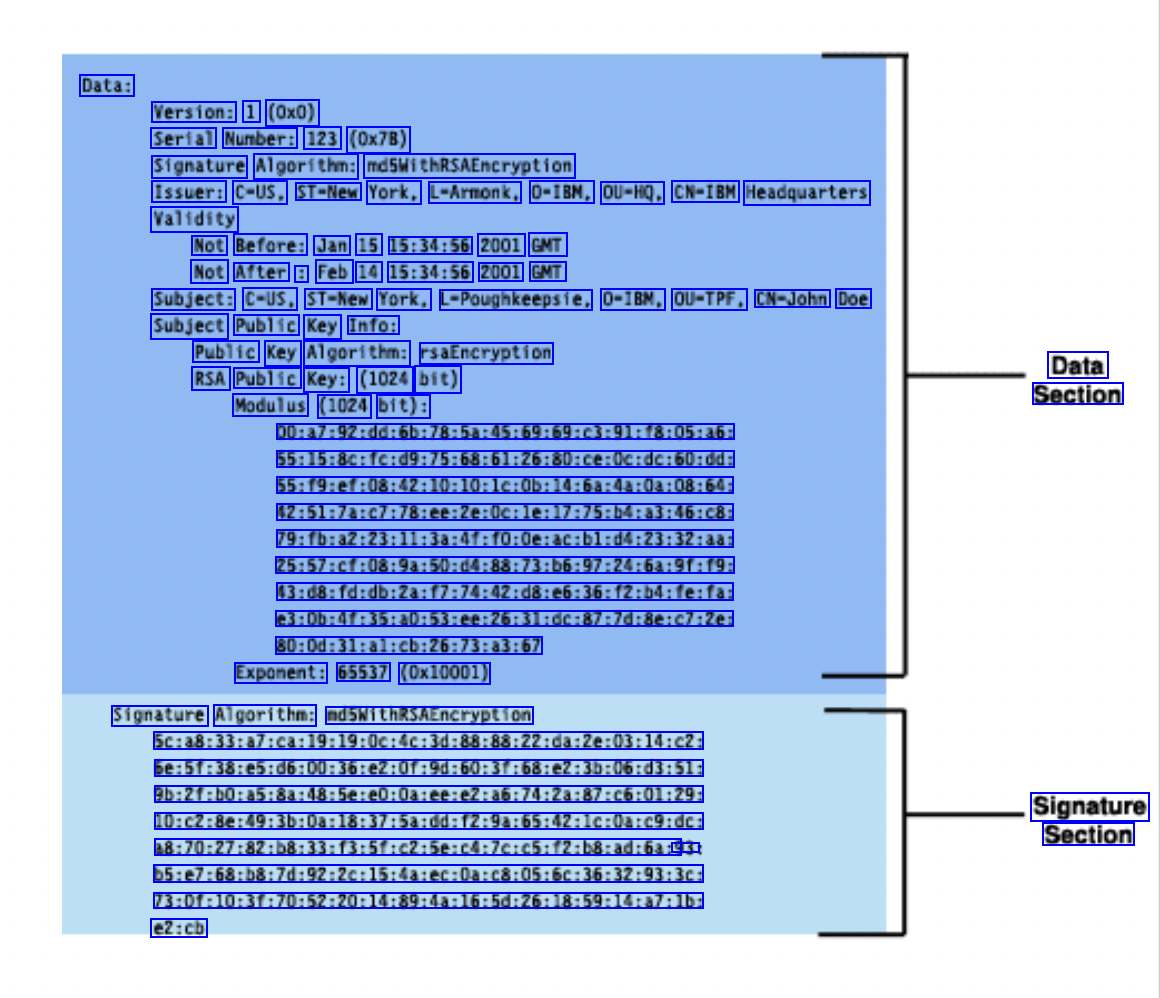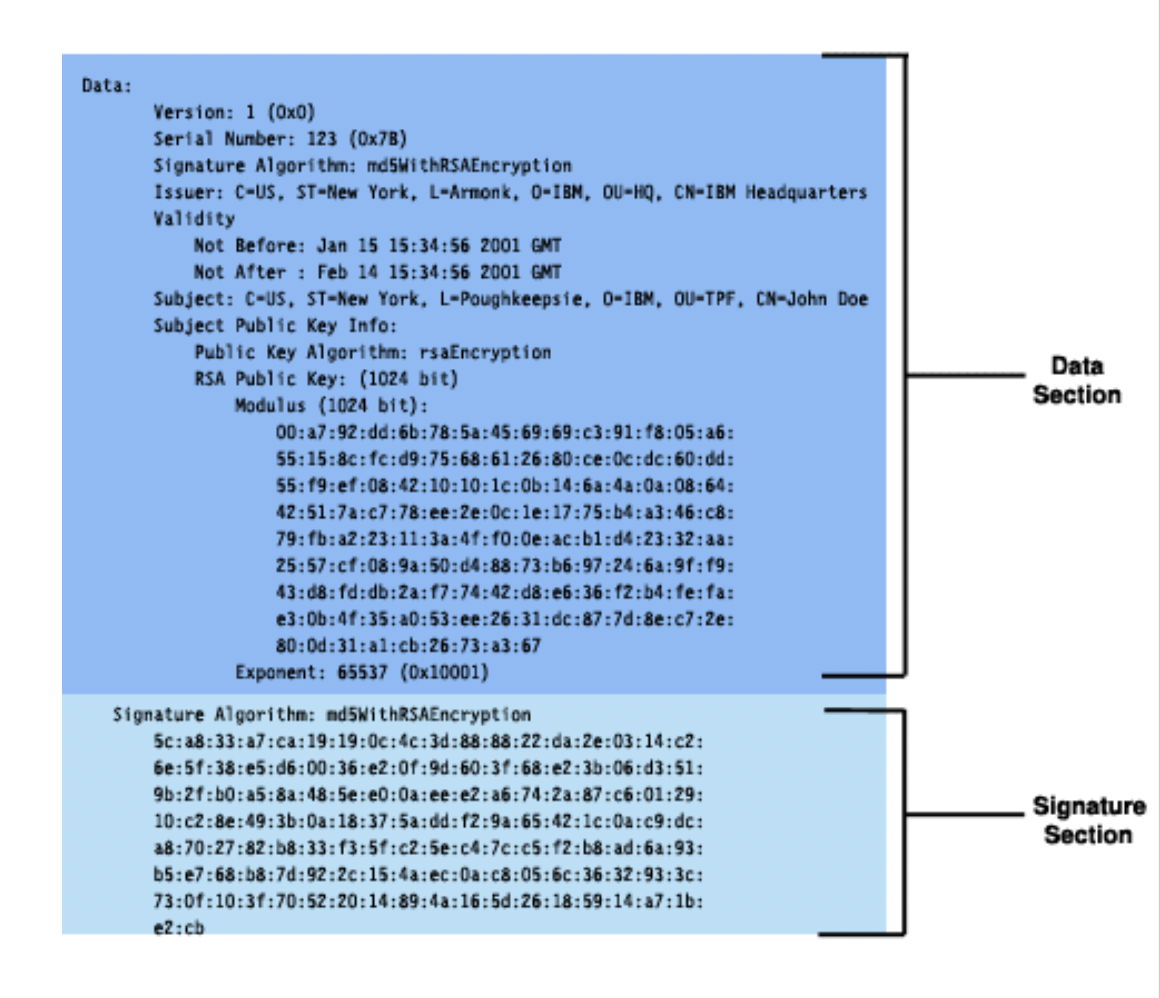 Data: Version: 1 (0x0) Serial Number: 123 (0x7B) Signature Algorithm: mdswithRSAEncryption Issuer: C-US, ST-New York, L-Armonk, 0-IBM, OU-HQ, CN-IBM Headquarters Validity Not Before: Jan 15 15:34:56 2001 GMT Not After : Feb 14 15:34:56 2001 GMT Subject: C-US, ST-New York, L-Poughkeepsie, 0-IBM, OU-TPF, CN-John Doe Subject Public Key Info: Public Key Algorithm: rsaEncryption RSA Public Key: (1024 bit) Modulus (1024 bit): Data Section 00:a7:92:dd:6b:78:5a:45:69:69:c3:91:f8:05:a6: 55:15:8c:fc:d9:75:68:61:26:80:ce:0c:Oc:dc:60:dd: 55:f9:ef:08:42:10:10:1c:0b:14:6a:4a:4a:0a:08:64: 12:51:7a:c7:78:ee:2e:0c:le:17:75:b4:a3:46:C8: 79:fb:a2:23:11:3a:4f:f0:0e:ac:bl:d4:23:32:aa: 25:57:cf:08:9a:50:04:88:73:b6:97:24:6a:91:19: 43:d8:fd:db:2a:f7:74:42:d8:e6:36:f2:b4:fe:fa: e3:0b:4f:35:a0:53:ee:26:31:dC:87:7d:8e:c7:2e: 80:0d:31:al:cb:26:73:a3:67 Exponent: 65537 (Ox10001) Signature Algorithm: nd5WIthRSAEncryption 5c:a8:33:a7:ca:19:19:0c:0c:4c:3d:88:88:22:da:2e:2e:03:14:c2: 6e:5f:38:e5:d6:00:36:e2:0f:9d:60:3f:68:e2:3b:06:d3:51: 9b:2f:b0:a5:8a:48:5e:e0:0a:ee:e2:a6:74:2a:87:c6:01:29: 10:c2:8e:49:3b:0a:18:37:5a:dd:12:9a:65:42:1c:lc:0a:c9:dc: a8:70:27:82:b8:33:f3:5f:c2:5e:C4:C4:7c:c5:f2:b8:ad:6a:5 : b5:e7:68:b8:7d:92:2c:15:15:4a:ec:0a:c8:05:6c:36:36:32:93:3c: 73:0f:10:3f:70:52:20:14:89:4a:16:5d:26:18:59:59:14:a7:1b: Signature Section e2:cb